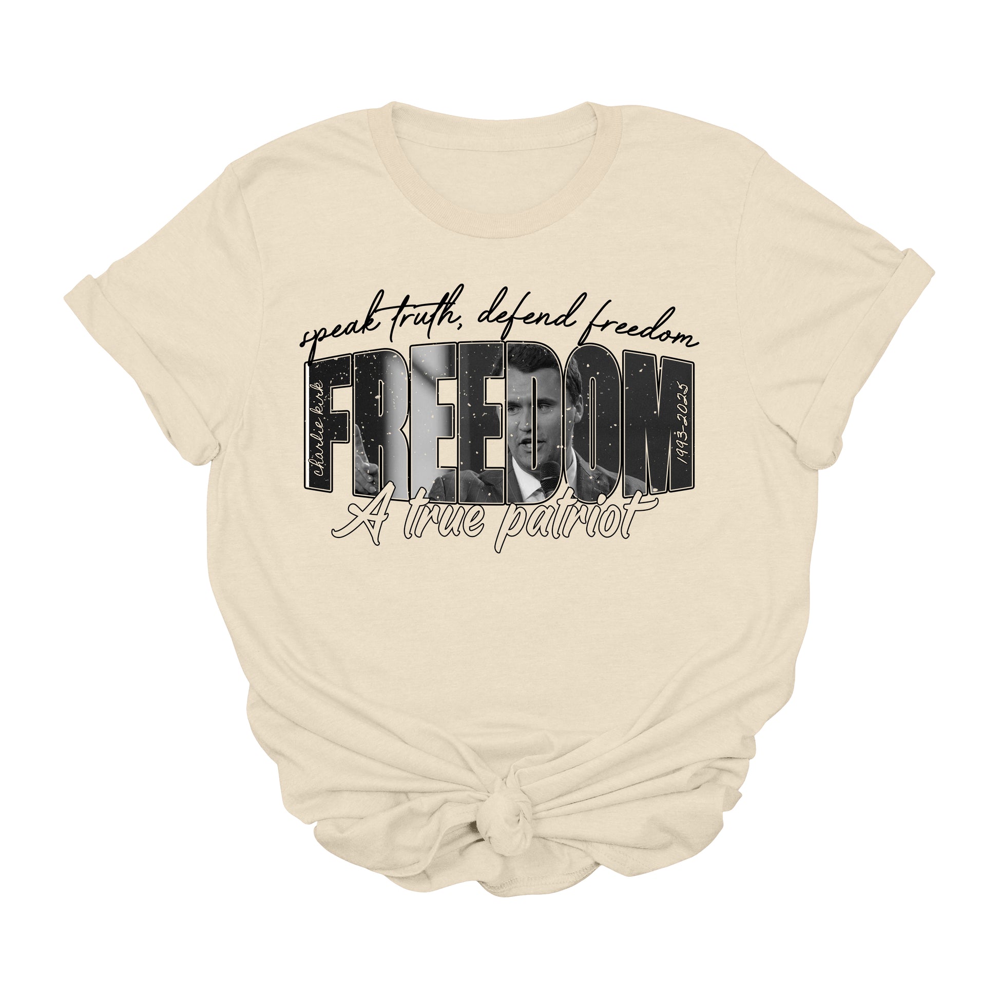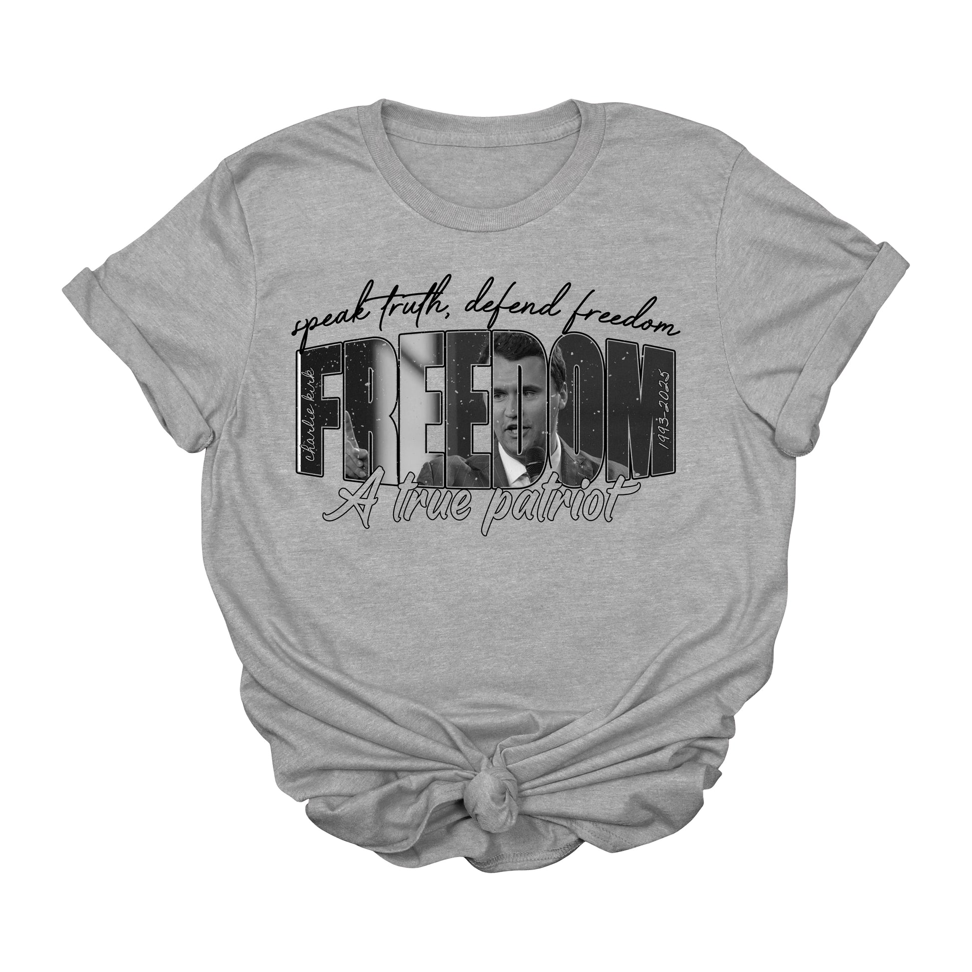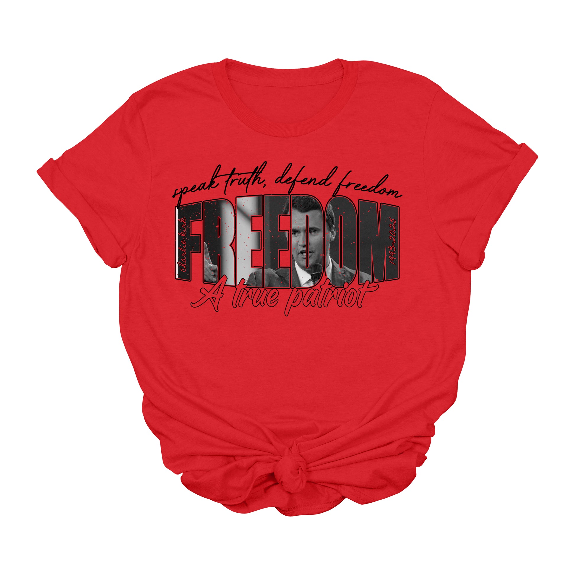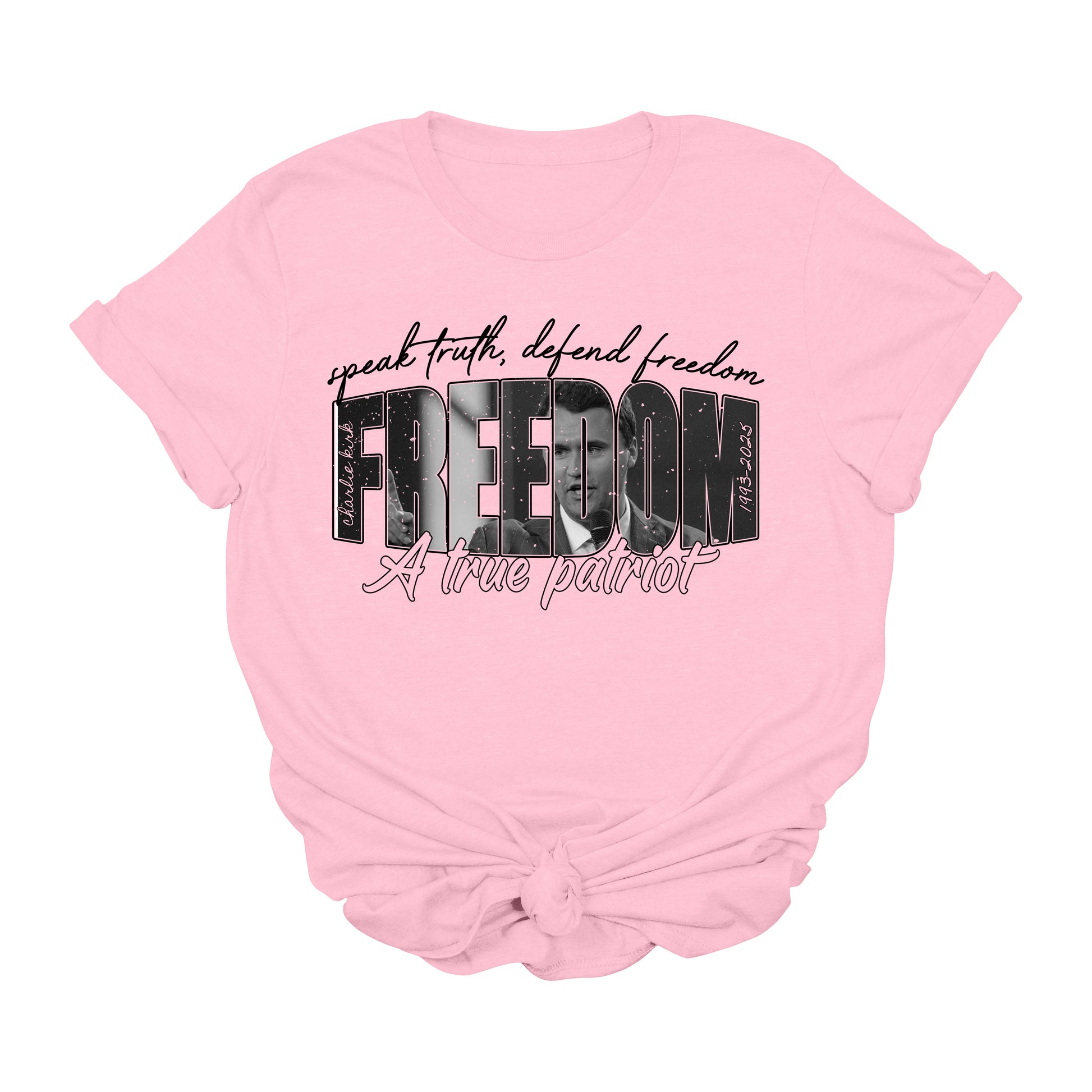 This Charlie Kirk βFreedom β A True Patriotβ T-Shirt in soft pink blends patriotic strength with a modern, stylish look. Featuring bold lettering with Kirkβs portrait and the empowering message βSpeak Truth, Defend Freedomβ, this shirt is a perfect mix of fashion and values.