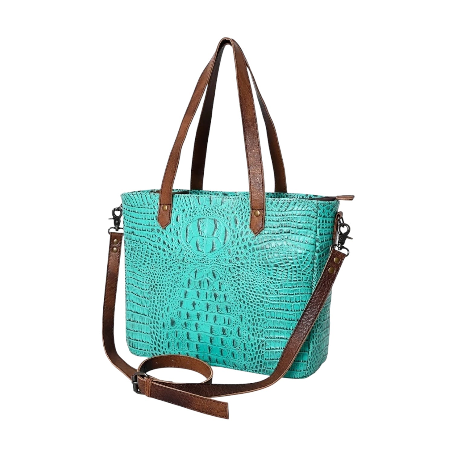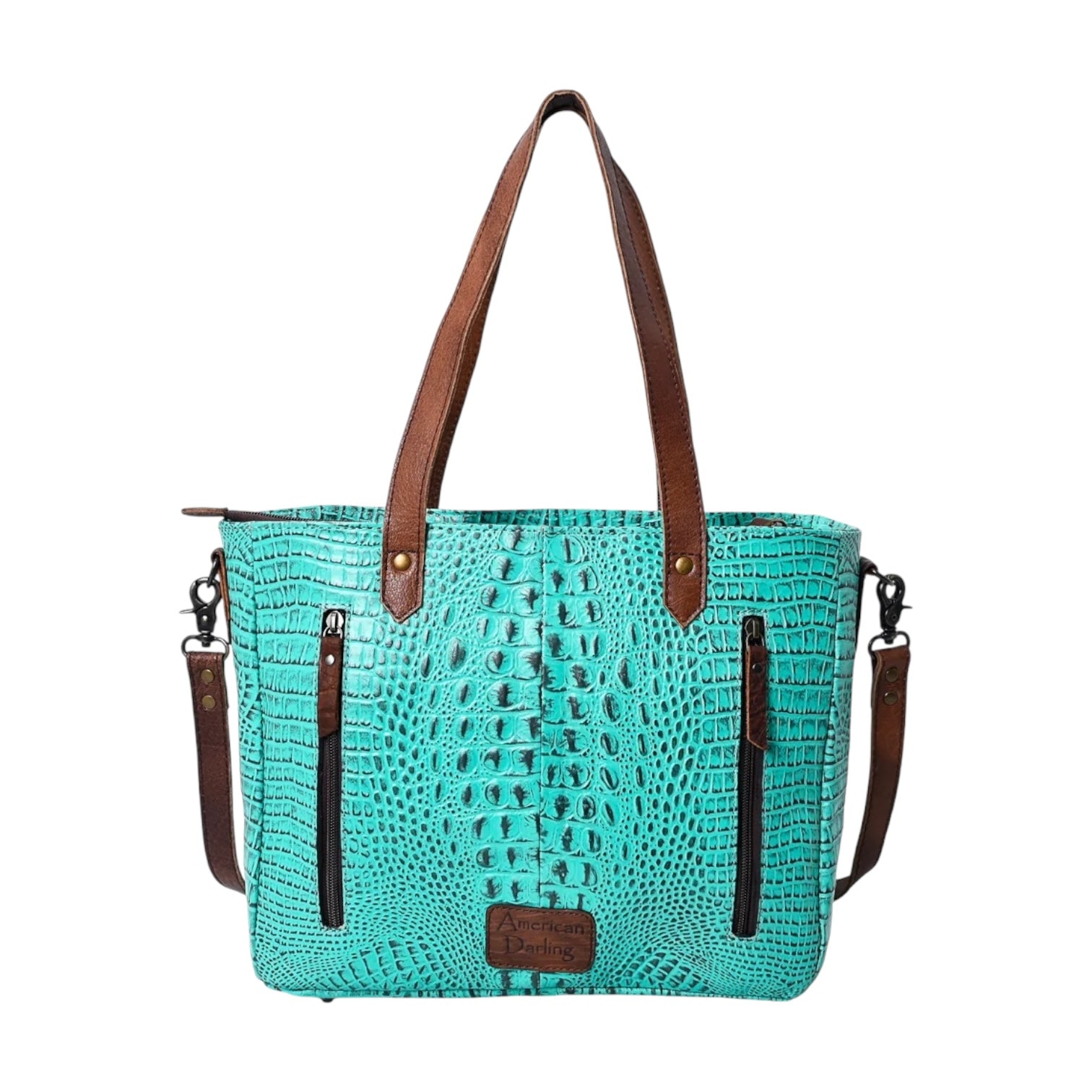 Turn heads with this bold and beautiful Crocodile Embossed Leather Handbag by American Darling. Crafted from genuine leather, this western-style purse combines luxury with rugged charm. Whether you're headed to the rodeo or running errands, this standout piece brings fierce fashion and authentic cowgirl vibes to any outfit. Crocodile embossed genuine leather exterior for a bold western statement | Spacious interior fits your daily essentials and more | Sturdy leather handles and durable construction for everyday use | Handmade craftsmanship by American Darling for premium quality | Size: 12in (H) x 14in (W) x 4in (D)