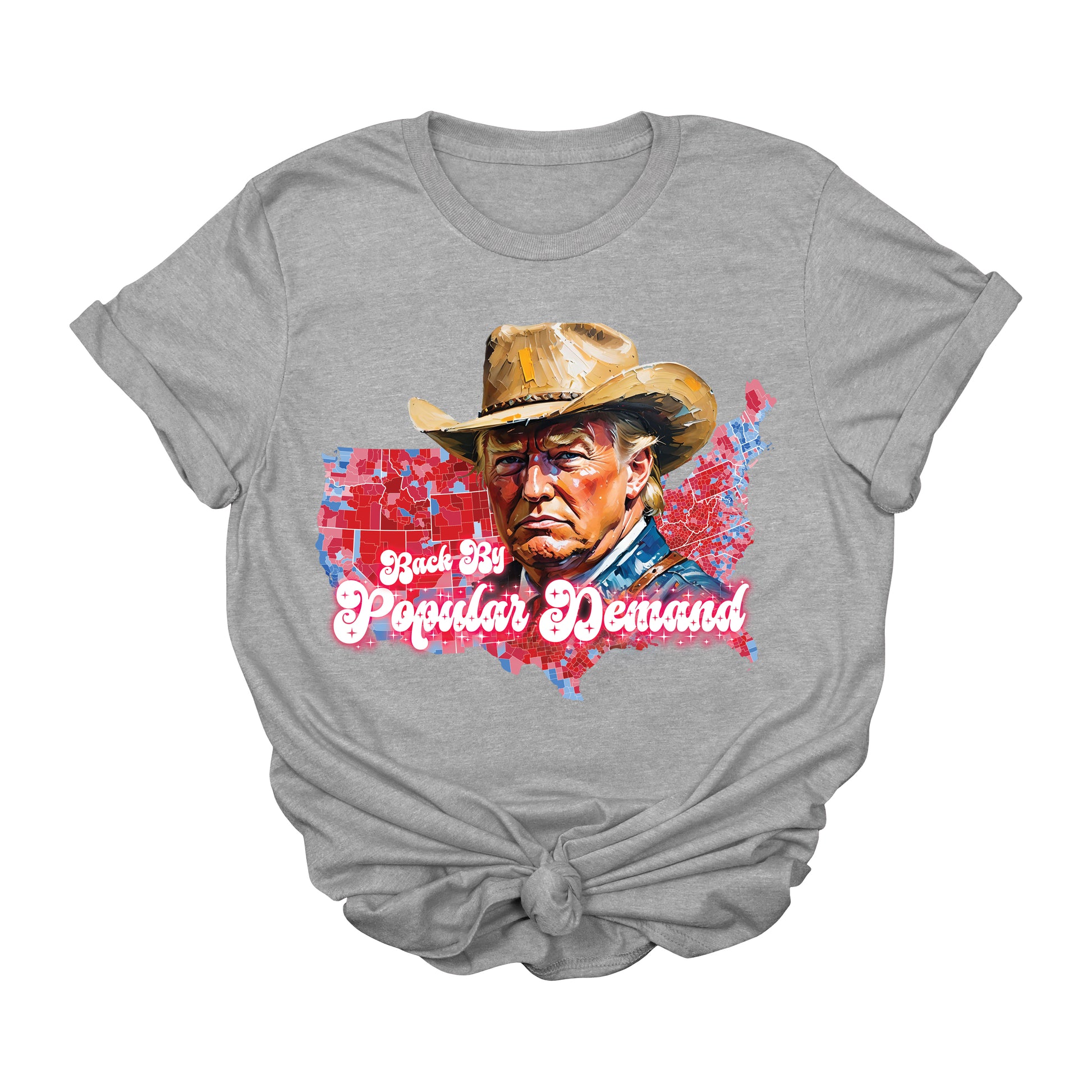 Trump Back By Popular Demand T-Shirt | Western Red Map Graphic Tee | Cowboy Trump 45 47 Shirt | Patriotic Political Apparel | Conservative USA Tee