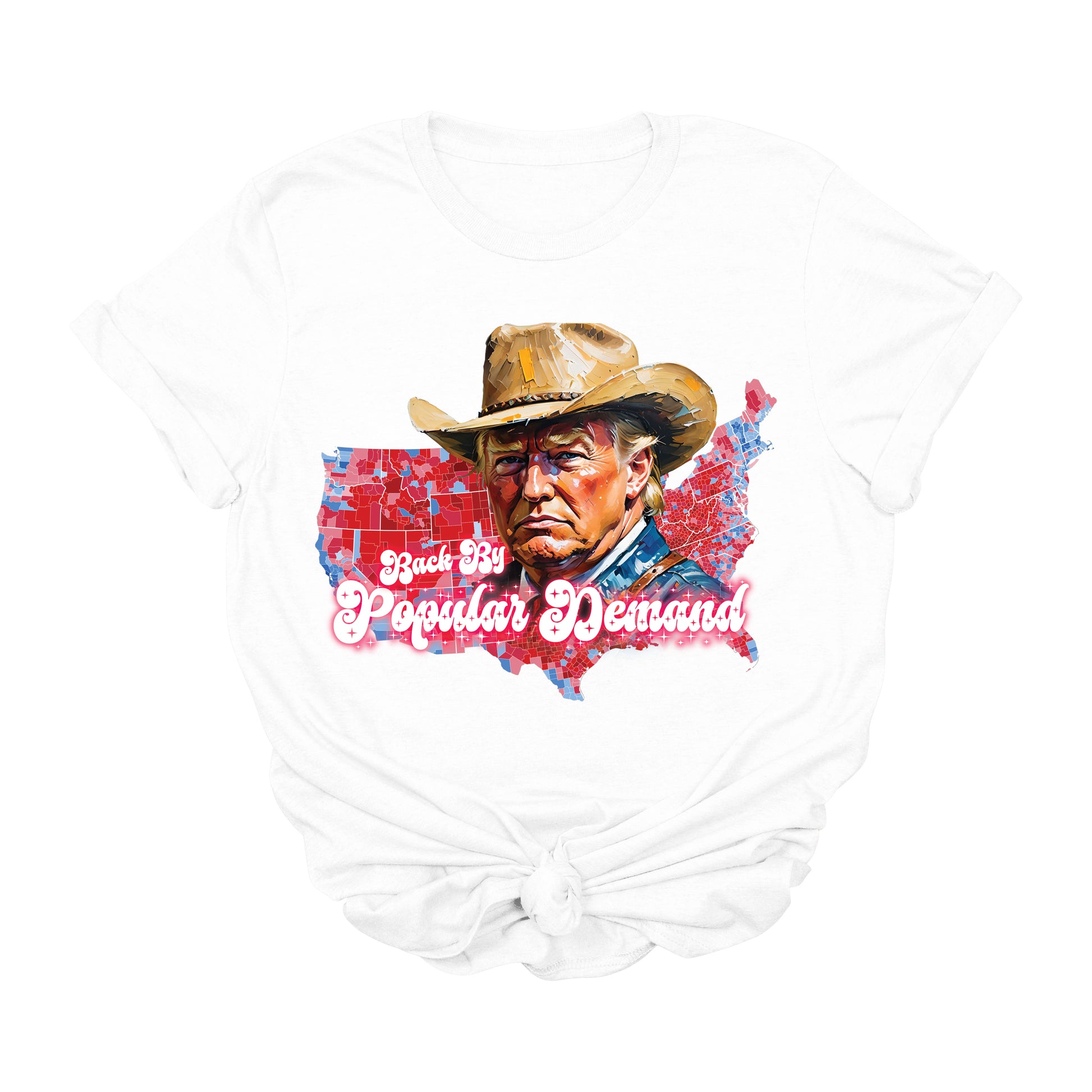 Trump Back By Popular Demand T-Shirt | Western Red Map Graphic Tee | Cowboy Trump 45 47 Shirt | Patriotic Political Apparel | Conservative USA Tee