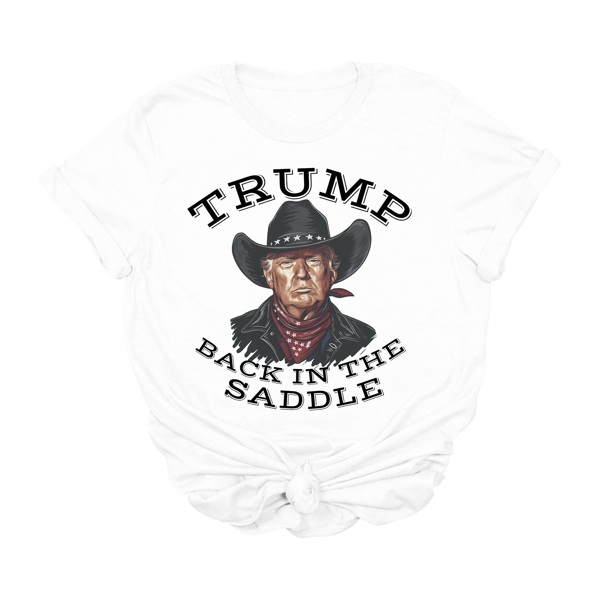 Trump Back in the Saddle T-Shirt | Cowboy Western Trump Graphic Tee | Political Comeback Shirt | Patriotic Conservative Apparel | Unisex USA T-Shirt